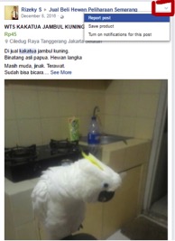 Terlibat Sebagai masyarakat, Anda bisa membantu mengurangi aksi perdagangan satwa liar dilindungi di Facebook yang telah melakukan kerja sama dengan berbagai pihak dalam hal pelaporan perdagangan satwa liar. Berikut, tahapan yang bisa Anda lakukan bila melihat grup yang memperdagangkan satwa liar. Dalam beberapa bulan ini, beberapa grup sudah ditutup. 1. Klik “tanda panah kebawah” pilih opsi “Report Post”.