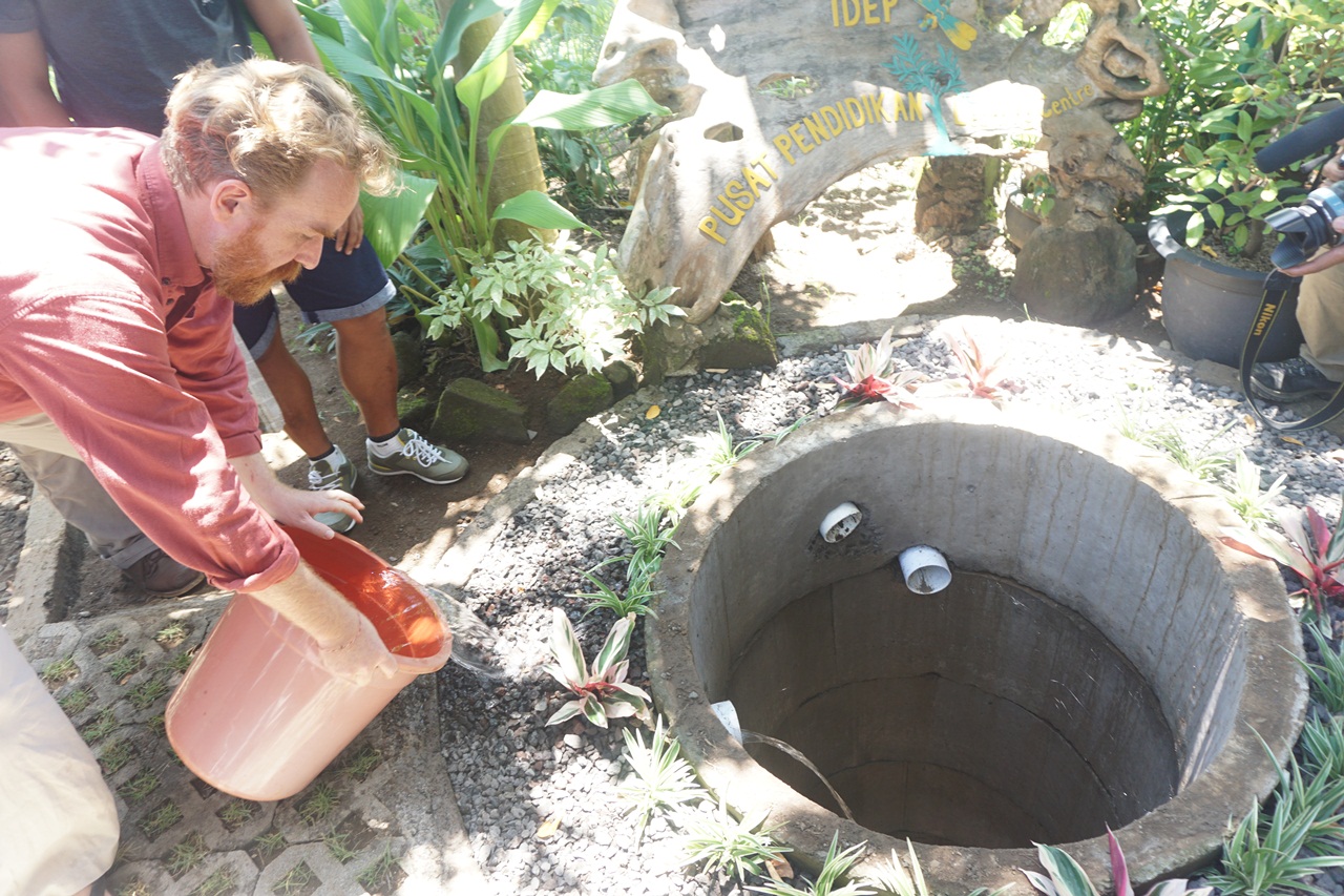 “Saat hujan, air permukaan paling banyak tapi kotor. Harus ada penyaring kotoran dan bisa ditanami tumbuhan atau rumput agar tanah tak lari ke sumur,” jelas Gede Sugiarta, salah satu staf Yayasan IDEP yang mendemonstrasikan recharge well di kantornya, Kemenuh, Sukawati, Gianyar, Bali. Yayasan IDEP adalah LSM Indonesia yang didirikan 1999, awalnya fokus di pendidikan kesiapsiagaan bencana. Sumur imbuhan ini didukung pembuatannya oleh Five elements, sebuah restoran dan resor hijau di Abiansemal, Kabupaten Badung.