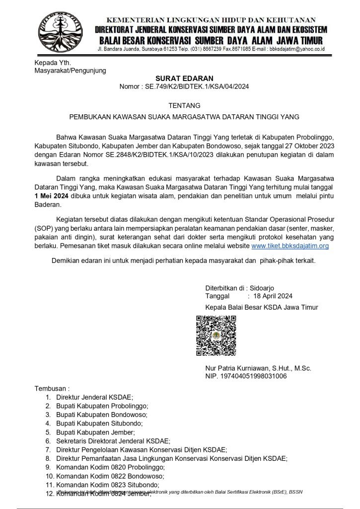 Suaka Margasatwa Dataran Tinggi Yang atau Gunung Argopuro segera dibuka kembali untuk kegiatan wisata alam, pendakian, dan penelitian mulai 1 Mei 2024, melalui pintu Baderan. Hal tersebut berdasarkan surat edaran Kepala Balai Besar KSDA Jawa Timur nomor SE.749/K2/BIDTEK.1/KSA/04/2024, tanggal 18 April 2024 tentang Pembukaan Kawasan Suaka Margasatwa Dataran Tinggi Yang.