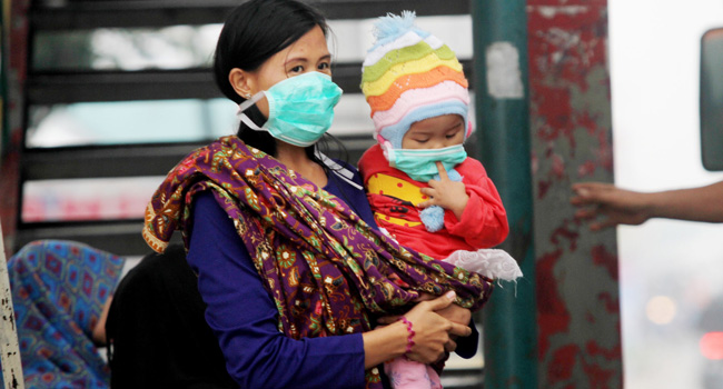 Ibu dan anak balita kenakan masker saat berada di halte Trans Metro Tabek Gadang Jalan Hr Soebrantas Panam Pekanbaru Riau. Jumat (2/10/2015) Asap tebal akibat kebakaran lahan membuat orang tua kenakan masker kepada anak saat berada diluar ruangan. foto: MG1/MIRSHAL RIAU POS[/caption]