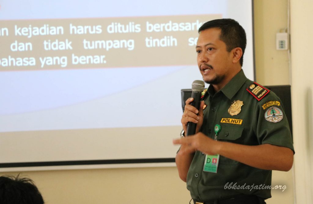 Selanjutnya Dheny Mardiono memberikan materi terkait penyusunan Laporan Kejadian dan Berita Acara Pemeriksaan. Selain itu, Dheny juga memberikan sosialisasi terkait Uji kompetensi bagi Polisi Kehutanan.