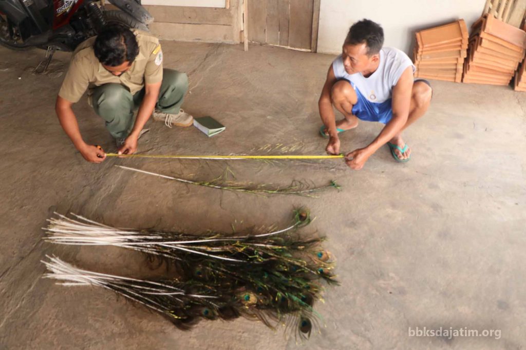 Penandaan spesimen bulu merak dilakukan dengan pemberian label berisi informasi nomor urut, identitas nomor tagging merak dan tahun rontok. Menurut Surat, selain untuk bahan pembuatan barongan Reog, biasanya juga untuk aksesoris, hiasan rumah, atau sovenir. (Endry Wijayanti, Tri Wahyu Widodo, BJ Anang Prasetya, Bidang KSDA Wilayah I Madiun)