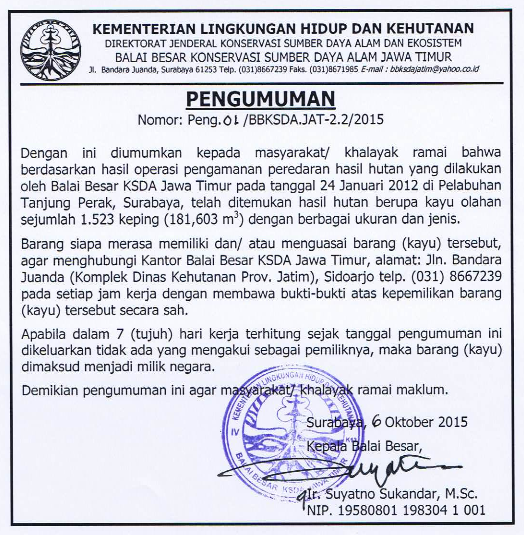 Pengumuman : telah ditemukan hasil hutan berupa kayu olahan sejumlah 1.523 keping dengan berbagai ukuran dan jenis
